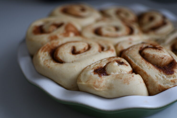 Patience pays off. 90 minutes later the dough has risen beautifully and is ready to bake. I preheat the oven to 150 degrees. When it reaches that temperature, turn the oven off. Crack the oven door slightly and let the cinnamon rolls sit in the oven with a kitchen towel draped over them. The oven allows for a warm spot perfect for rising dough.