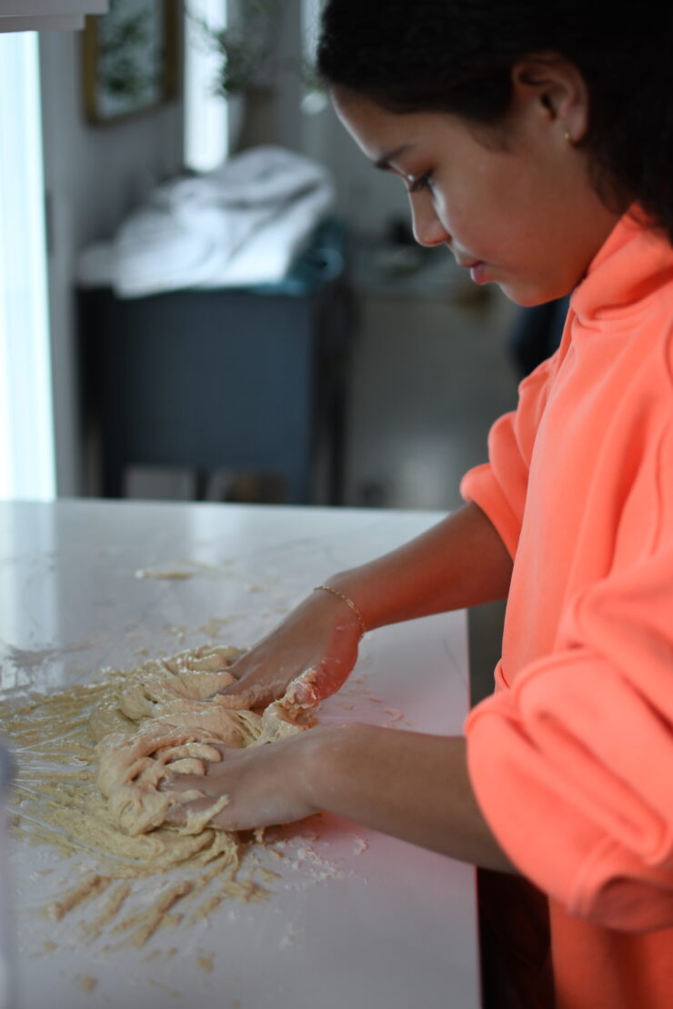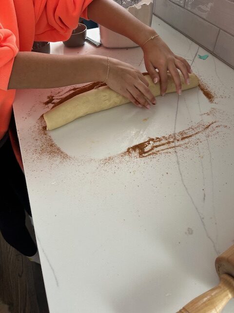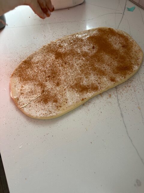 This part is so fun-roll the dough into a 14 inch log and then cut into 10-12 even cinnamon rolls.