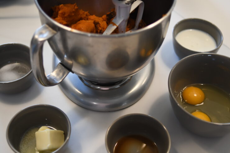 - Mix sweet potatoes, sugar, salt, eggs, softened butter, milk, and vanilla together in a stand mixer. Pour into casserole dish.