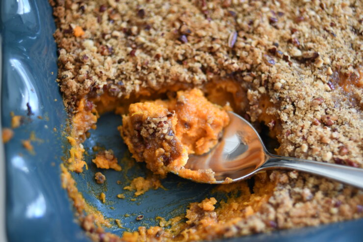 Everyone has their favorite family recipe for Thanksgiving. For me, it is this sweet potato casserole my sister in-law makes. It has become my favorite part of the Thanksgiving meal. As a kid, I ate 3 rolls at Thanksgiving. I hated all the sides and how they ran together and touched on the plate. I’m reminded as an adult to be patient and gracious with my kid’s picky palates and odd culinary requests. I brought this dish to a Friendsgiving last night and every kid ran around and ate candy, and every adult devoured the food. So, taste buds change and I’m looking forward to the day my kids request sweet potato casserole instead of fruity pebbles.