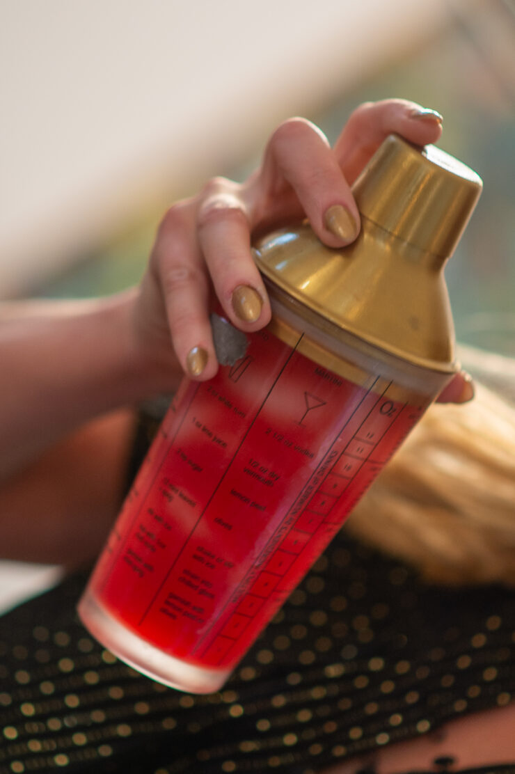 - When ready to serve, fill a cocktail glass with ice. Next, fill a cockatil shaker with ice. Pour 6 oz. beverage into the shaker. Fasten the top firmly and shake vigorously for 15-30 seconds. You will feel the outside of the shaker getting cold.