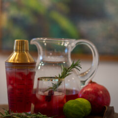 Here is a simple recipe to make a similar drink without alcohol. Combine ingredients below and stir. Serve over ice and garnish with rosemary sprig and cranberries.