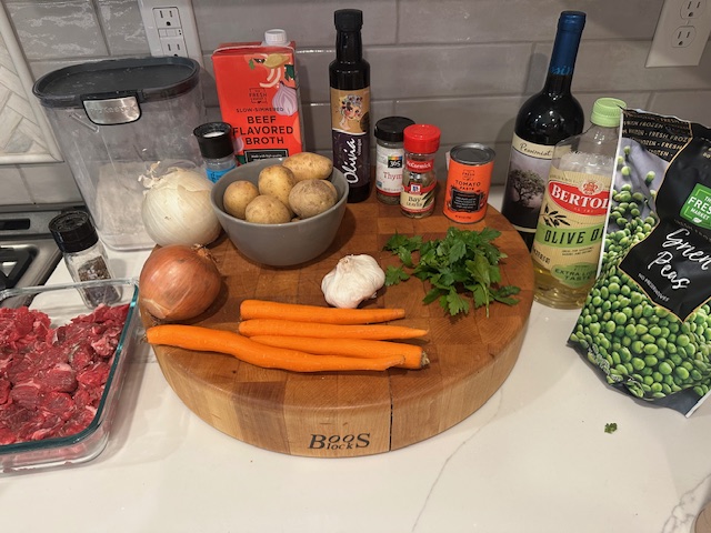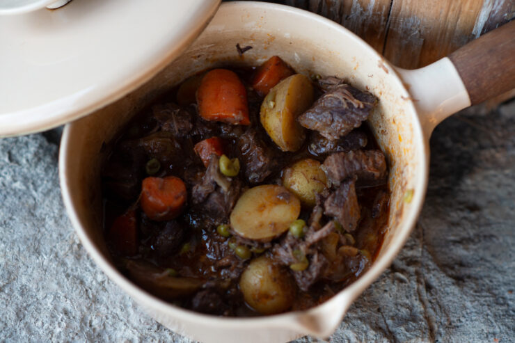 I like to make this a day in advance. Then, the day you are having people over heat up some bread in the oven, make a simple green salad, and get store bought premium ice cream and toppings for dessert. Serve stew with a hearty red wine, such as Cabernet, which is known for its bold flavor and can stand up to a flavorful beef stew.