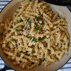 Katie's Tips:*Be sure to add a large handful of salt to the water before you cook the pasta. This is your only time to flavor the pasta.*Cook pasta just until done. In Italian this is called al dente, meaning a little bite. Insert childhood memory of my dad yelling at my mom for overcooking the pasta. If the box says 9-11 minutes set timer for 8:30 and do a taste test.*Use white wine that you would drink. I like to drink and cook with pinot grigio. I accidentally used a Diamond Mountain Chardonay for this recipe today. My husband informed me it was 200 dollars. Oops. I guess I have to drink the rest tonight! I usually cook with a 15–20-dollar bottle of wine. *I like to tramsfer the cooked pasta directly into the pasta sauce. The starchy pasta water helps to thicken the sauce and bring the whole dish together.*I always boil a pound of pasta. 3/4 lb. fits well in the pan and is a perfect ratio for the other ingredients. I use the extra noodles to serve my daughter buttered noodles. *Be sure to use Parmesan Reggiano cheese. The processed Parm will not melt properly. You can tell it's real by the writing on the rind of the cheese.*To add some acid to this dish, chopped sundried tomatoes are an excellent addition.*If I am serving this to just adults, I often sprinkle with chopped Italian flat-leaf parsley. I find kids are typically averse to green garnishes.*If you can't find fusilli, just go with Rigatoni or Rotini. Any short tubular pasta will work. *This pasta reheats like a gem for a perfect next day lunch.
